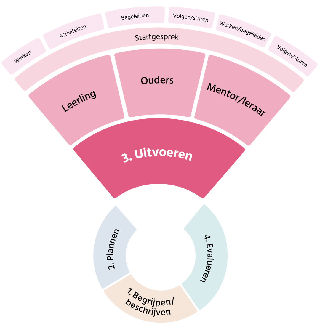 In deze stap gaan de leraar en de leerling aan de slag. Dit kan beginnen met een startgesprek tussen de leraar, leerling en ouders om de doelen helder te krijgen en afspraken te maken die tijdens het plannen zijn besproken. Doe dit bij voorkeur op locatie waar de leerling het afstandsonderwijs gaat volgen. In de onderstaande afbeelding zie je een visualisatie van deze stap.